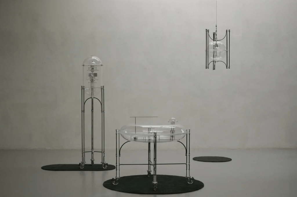 Capturing Qi is a project that brings three feng-shui objects into the digital age by making them smart devices that you can control through an app to bring energy into your home. You get a crystal ball, a wind chime, and a water fountain were designed to look like scientific equipment and was inspired by the 18th century vacuum chambers. The crystal ball and water fountain have castor stands while the wind chime is a hanging piece.